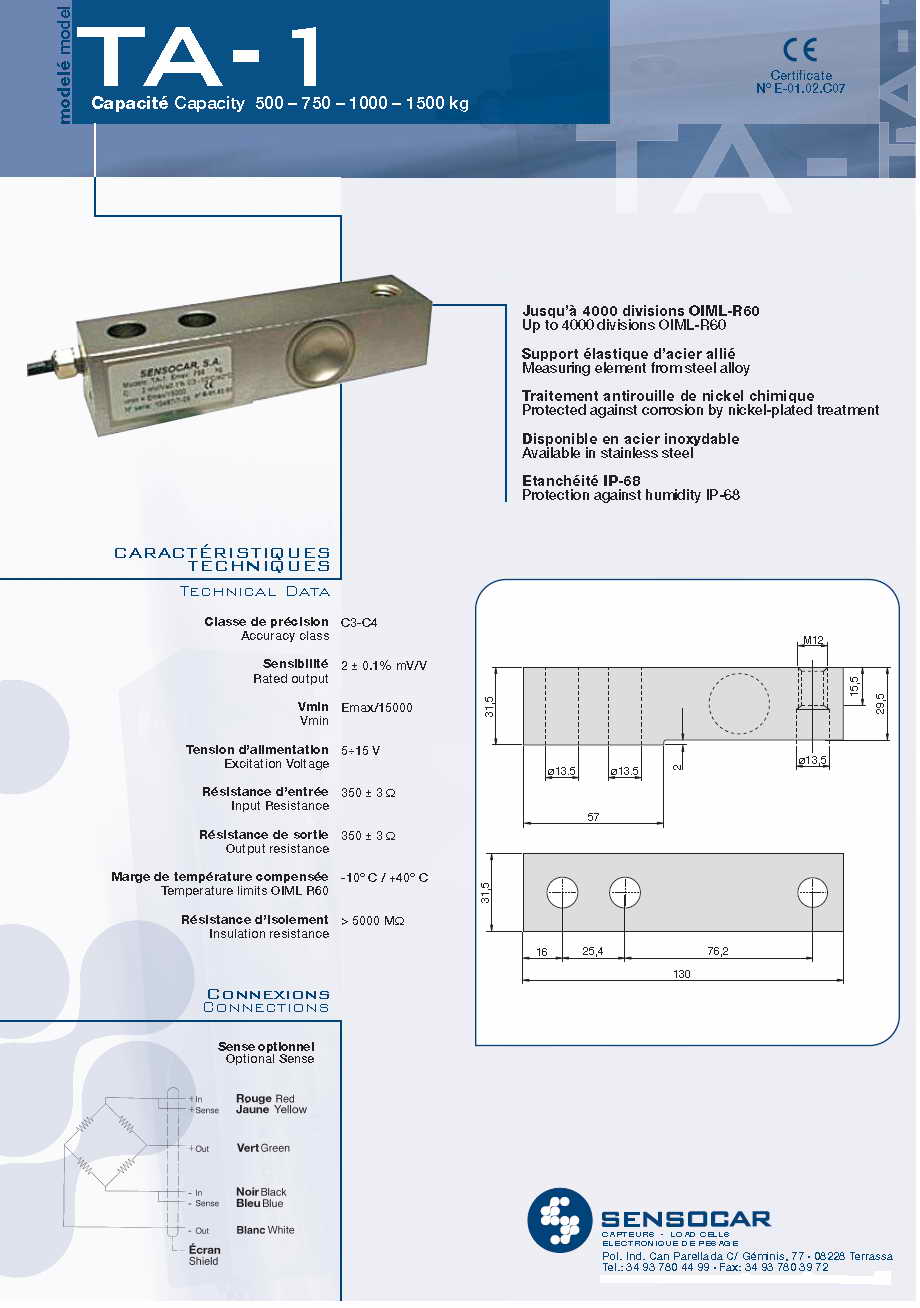 產(chǎn)品名稱(chēng):Sensocar TA-1 懸臂梁式稱(chēng)重傳感器(load cells)
