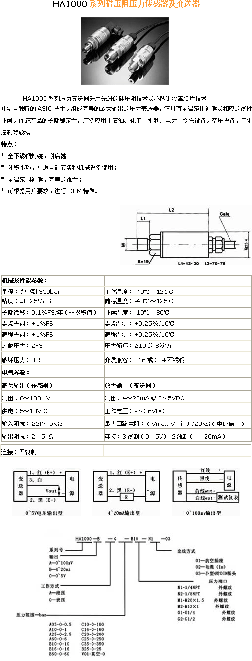 HA1000系列 硅壓阻壓力傳感器(pressure sensor):